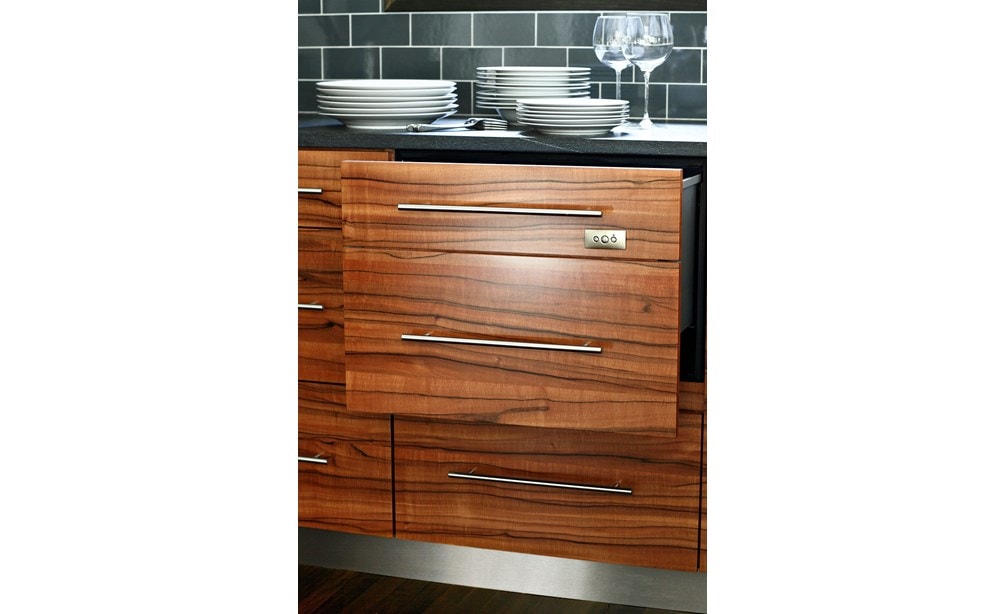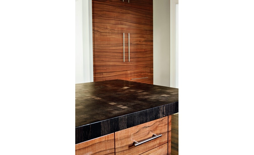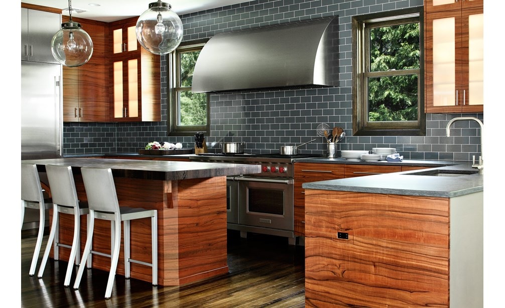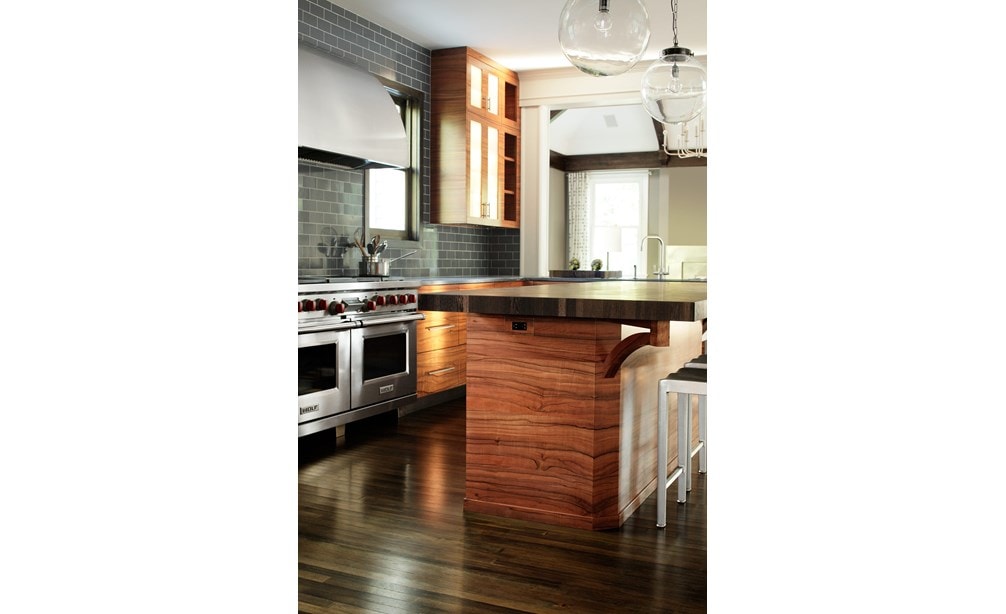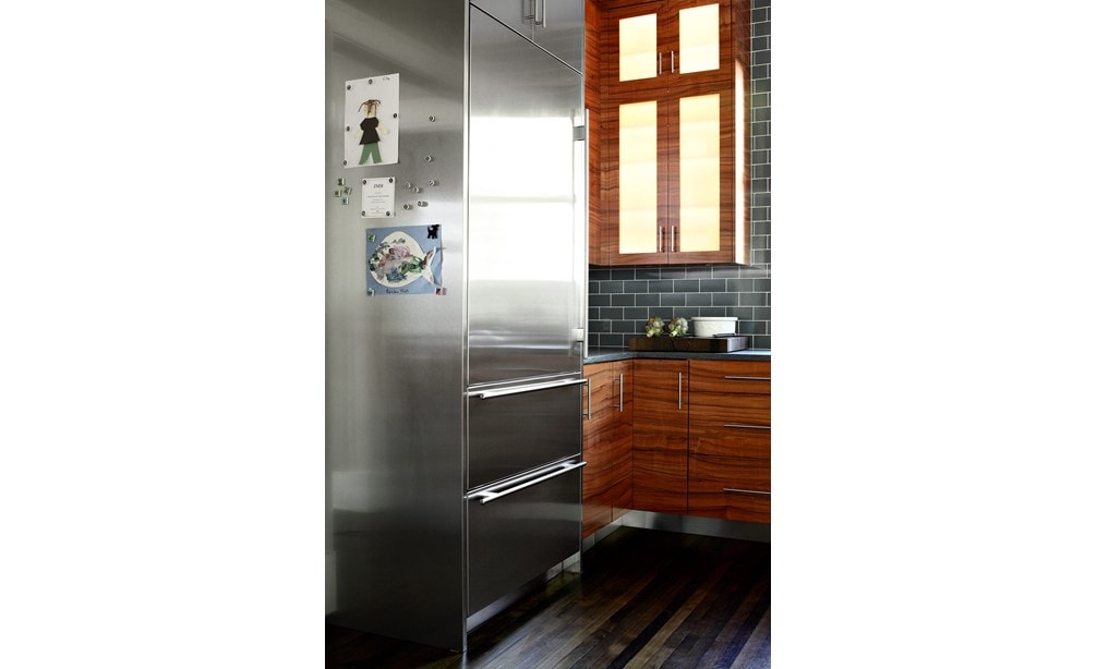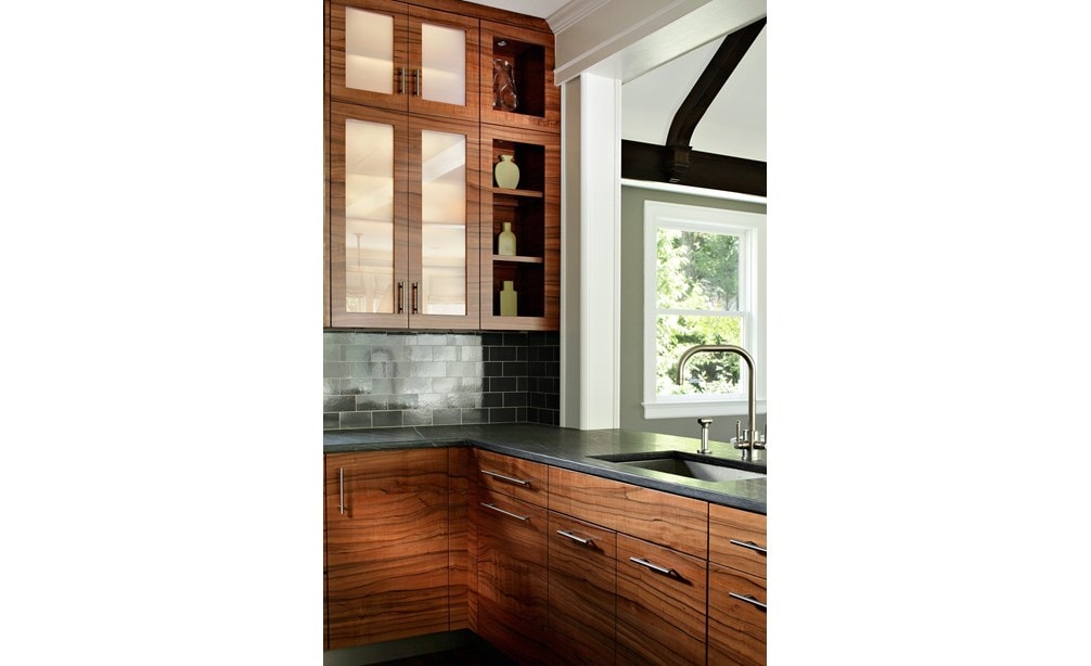 While the “before” kitchen was renovated by the prior owners only 10 years ago, the new homeowners – having just moved from Manhattan to the suburbs – envisioned a sleek contemporary kitchen with an interesting wood grain. European Applewood was selected for its beautiful color and undulating grain characteristics. The challenge was selecting appliances and materials that complement the remarkable wood. The wood grain is matched and placed in a horizontal pattern on flat panel doors, allowing for your eye to follow the grain pattern around the room. Sub-Zero appliances were selected since they virtually disappear behind door panels. The finishing topcoat was an acrylic urethane to reveal the full character of wood grain. The Wenge wood island countertop espresso coloring picks up the distinctive wood grain; Pietra di Cardoso for perimeter countertops blends with stainless elements. Translucent grey-blue glass tile captures the attractiveness of the warm wood tones, and grain-matched outlet covers and stainless toe kicks complete the kitchen details.