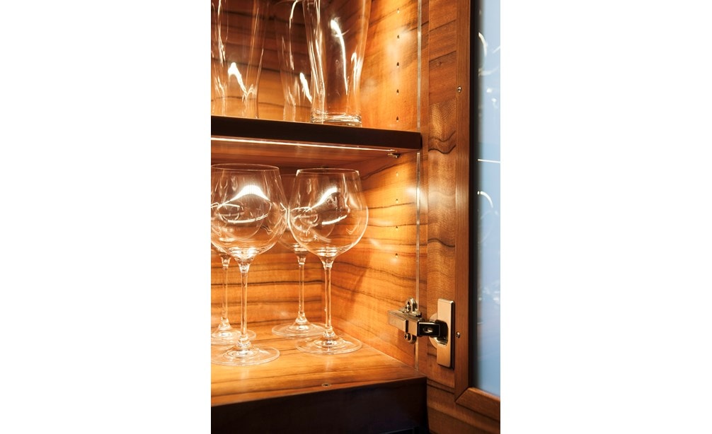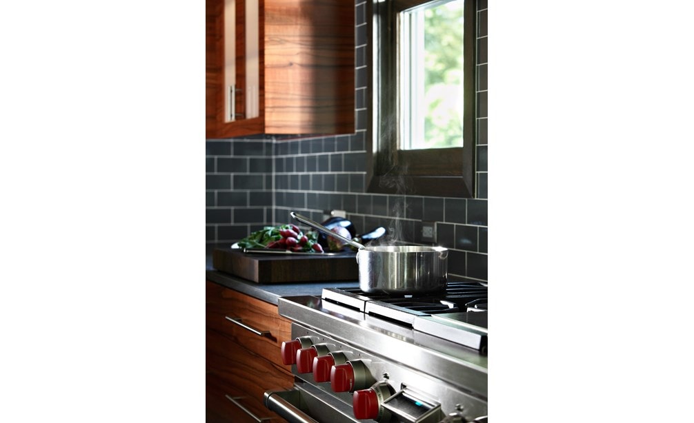Fuel Range with its professional look, famous red knobs and its "performance under pressure" wins the husband’s heart. Additionally, the wall cabinet with white laminated glass doors has special LED lighting inside which is routed into the shelf bottom and can be easily adjusted without any loose wires. LED lights are less hot, last longer and use less energy. Lastly, magnetic stainless refrigerator end panels serve as a place to display children’s art.