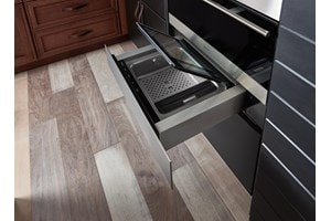 El cajón sin tirador y de apertura a presión encaja en cualquier lugar gracias a su diseño discreto y sutil. Disponible en anchuras de 24" y 30" y en acabado inoxidable, cristal negro o panel personalizado.